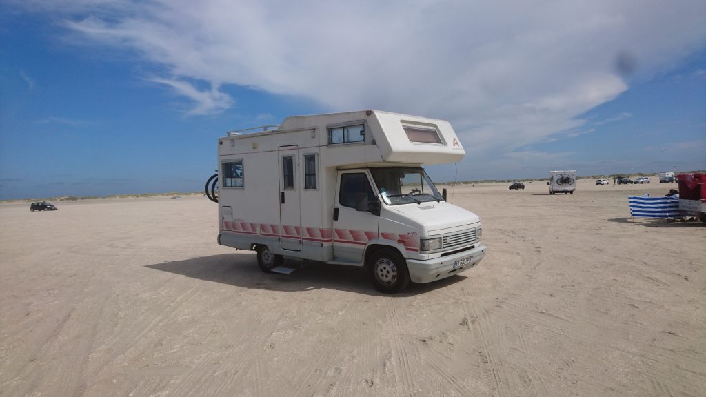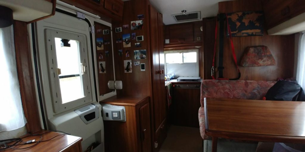 Concernant notre camping-car, c’est un C25 4×4 95ch TD de 1993, on l’a acheté à 148 000 Km, il est actuellement à 163 000 (août 2018). Le choix du camping-car s’est déjà fait par rapport au budget. Pour moins de 10 000 € ça limite un peu. Ensuite il était à transmission intégrale. Pour un tour du monde ça peut être un plus. Ce qui m’a décidé ensuite, c’était l’équipement de la cellule Autostar 421. On a le chauffage par eau chaude qui fait le tour de la cellule et qui peut être chauffée soit au gaz, soit par récupération des calories moteur lorsqu’on roule (Chauffage ALDE). Du coup, c’est pareil pour l’eau chaude, des douches et de la vaisselle. Un bon petit plus. Ensuite la disposition de la cellule, idéale pour nous. Cuisine en L, coin douche, et lit capucine. L’autre plus, c’est le panneau solaire. On ne reste jamais plus de deux jours au même endroit, et on n’a jamais eu moins de 50% de la batterie cellule. On est aussi équipé full LED pour la cellule.